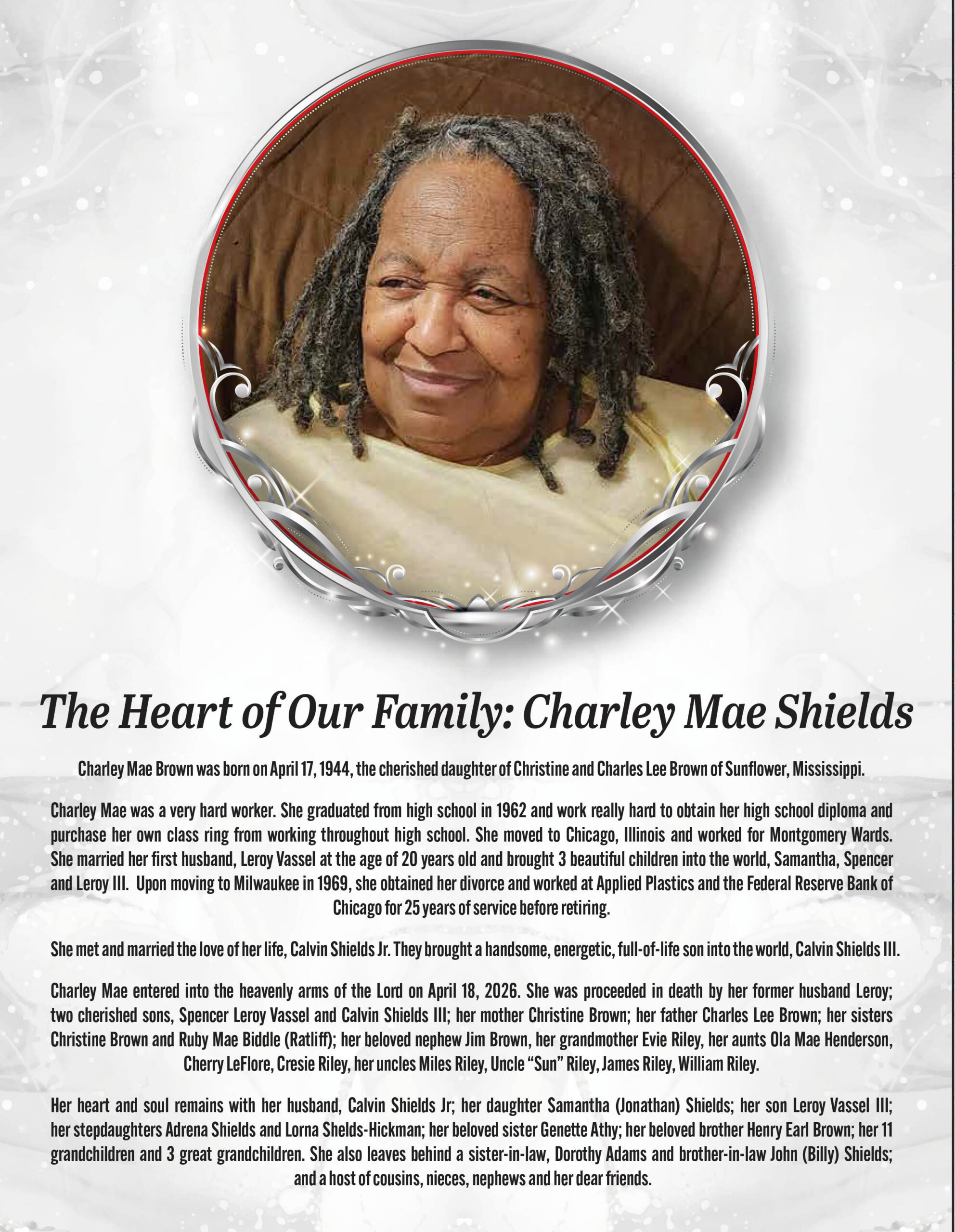 To those who knew Ms. Charley and held her close, I hope you find peace and healing in the beautiful memories you shared—memories that will last forever. Please read Revelation 21:3, 4 where sickness and death is no more.