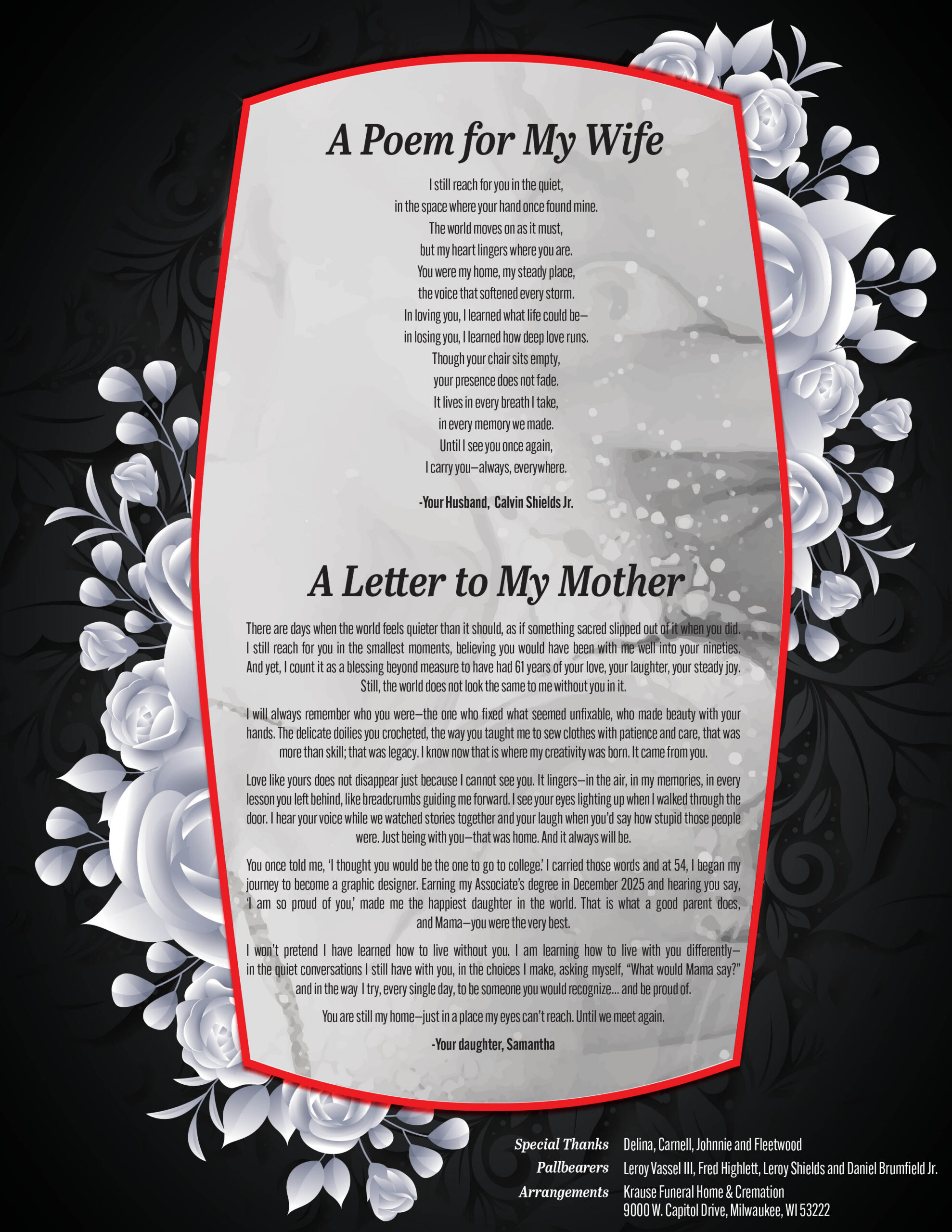 I’m sorry for your loss of your Mom, Samantha and Leroy, she will always have a special place in my heart, such a beautiful woman (inside and out) I’ll cherish her memories forever….. LOVE YOU, Aunt Beather